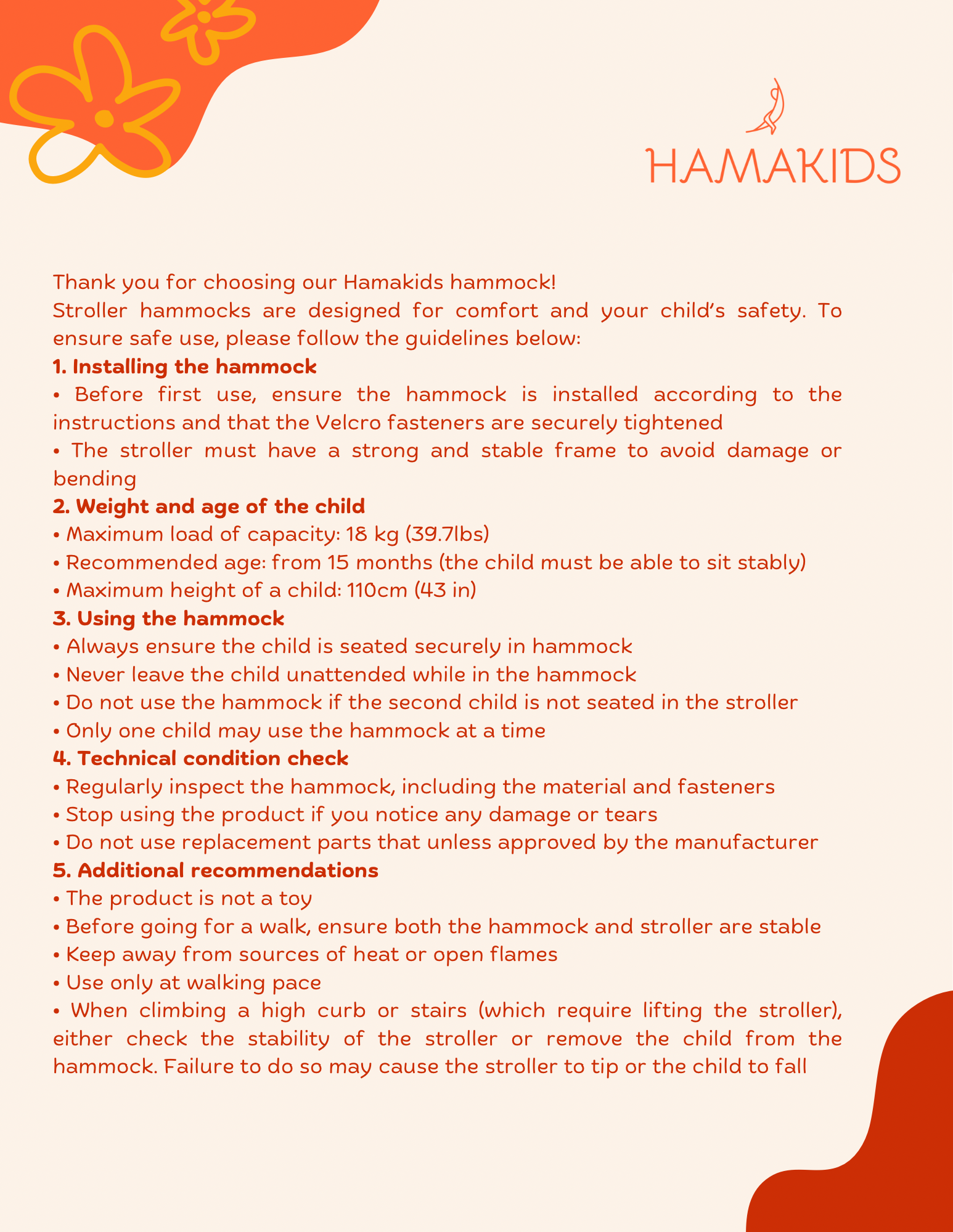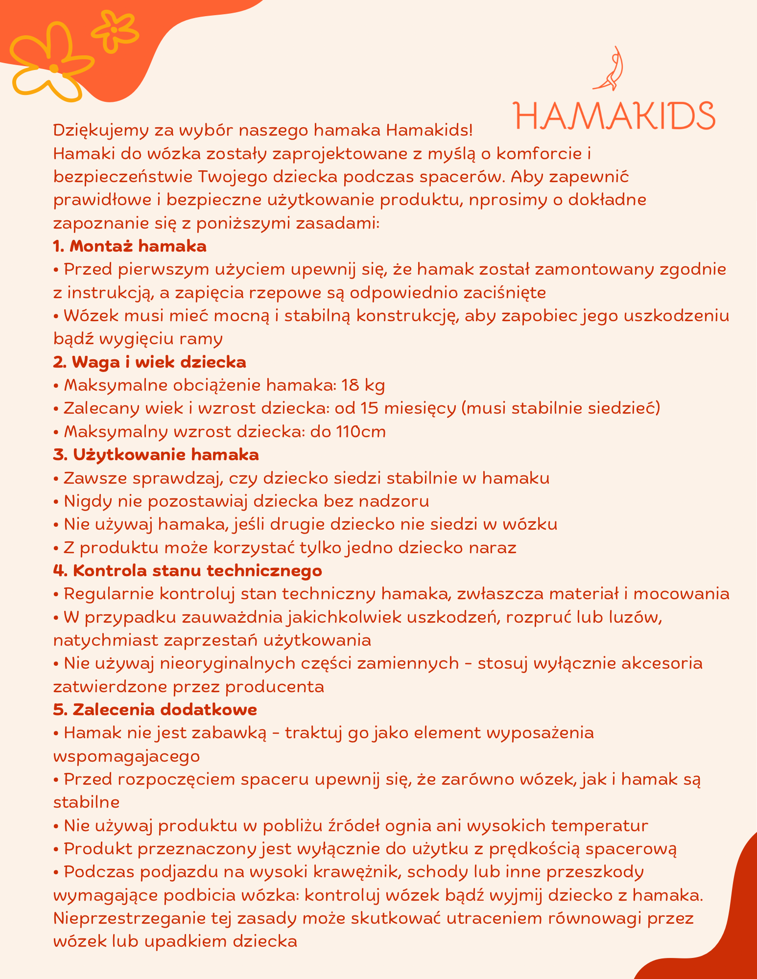 •Nigdy nie zostawiaj dziecka bez opieki podczas korzystania z hamaka