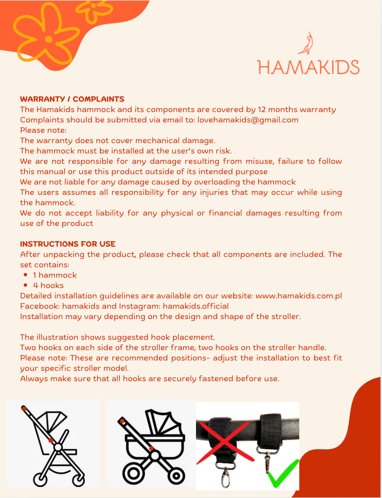 Instalacja hamaka jest szybka i nieskomplikowana – wystarczy chwila, by zamocować go na ramie wózka. Gdy nie jest używany, można go łatwo złożyć i schować do torby, plecaka lub koszyka pod wózkiem. Idealnie sprawdzi się zarówno podczas codziennych spacerów, jak i na rodzinnych wyjazdach. Może pozostać zamocowany na wózku nawet wtedy, gdy nie jest wykorzystywany – nie wpływa to na komfort prowadzenia.